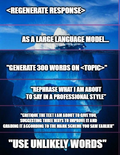 Many of us have already seen blatant cases of generative AI-enabled contract cheating (some call it, rather inappropriately, plagiarism). A colleague saw an essay that began with “As a large language model…”; I received a reference whose last sentence was “Regenerate response”; other people have seen other similarly ridiculous things.
